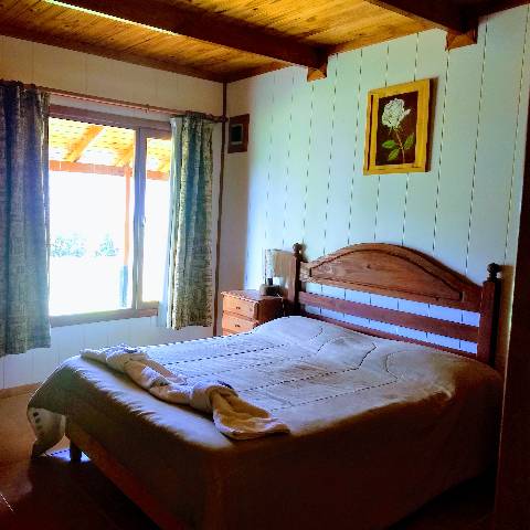 Esta cabaña cuenta con 2 habitaciones en planta alta (matrimonial y otra con 3 somieres individuales).